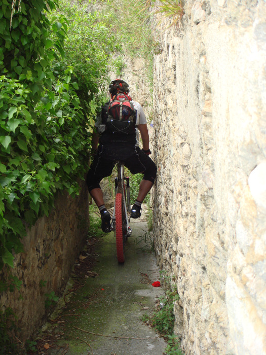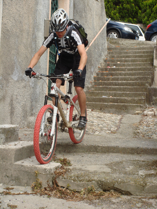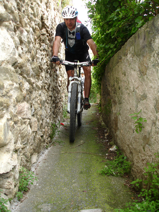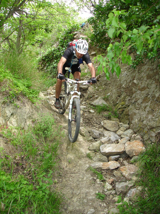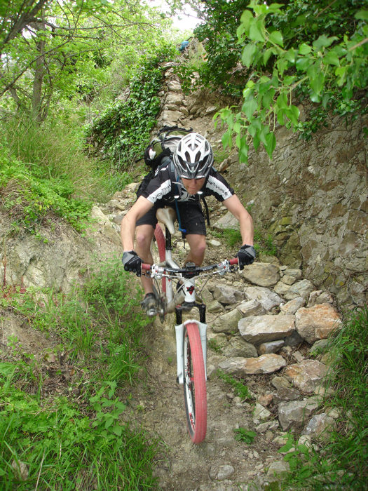 Ich liess es gemütlich angehen, weil ich ja wusste, dass es eine lange und anstrengende Tour geben wird. Die Vögel zwitscherten im Wald und viele kleine Waldblumen versprühten ihren Frühlingsduft. Da heisst es tief durchatmen und geniessen. Nach den ersten drei Hügeln machte ich eine erste Pause und verspeiste einen Apfel. Bald schon fuhr ich weiter und der Tourverlauf erinnerte mich an die Feststellung, die ich schon vor zwei Jahren gemacht habe. Es folgen immer wieder sehr steile bergauf-Rampen, die ich entweder nur in den kleinsten Gängen schaffe, oder wo ich dann wirklich schieben muss. Der Fussweg nach Manzenhueb ist so ein Beispiel. Anfangs wird es immer steiler und ich kämpfe mich im kleinsten Gang so weit hoch wie möglich. Dann absteigen und schieben. Es wird so steil, dass selbst schieben schwer fällt. Das macht man ja alles nur dafür, dass man auf der Rückseite des Hügels dann einen prächtigen Wanderweg runter fahren kann. ![]()