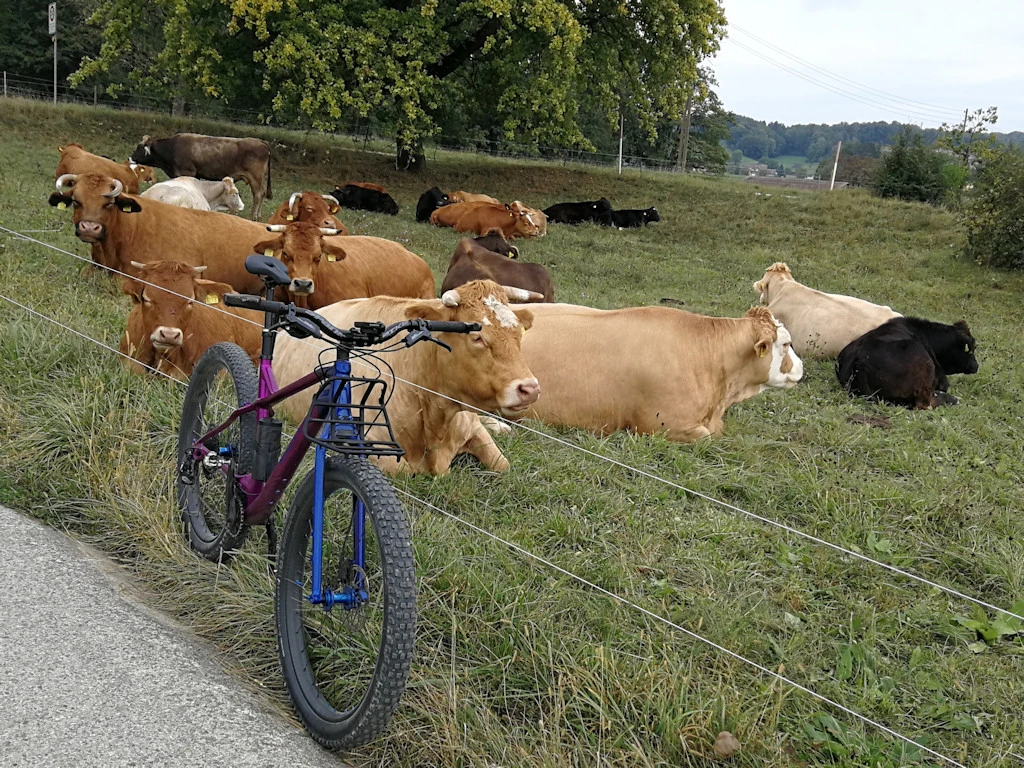 Ich machte nur eine ganz kurze Testfahrt. 20 Kilo Gepäck ist schon heftig. Die Gewichtsverteilung ist klar hecklastig und das merkt man auch. Die Front fühlt sich leicht an und bergrunter schiebt das Heck deutlich. Trotzdem musste ich den blauen Packsack noch etwas nach hinten schieben, weil ich sonst beim treten mit den Oberschenkeln an die Tasche stosse, was nervt. Der Gepäckträger hält die Taschen perfekt und stabil. Auch im Wiegetritt klappert nichts. Insgesamt bin ich zufrieden. Das leichte Vorderrad ist ganz klar der Preis für meine Ablehnung für Fronttaschen oder eine grosse Lenkertasche. Das passt schon...