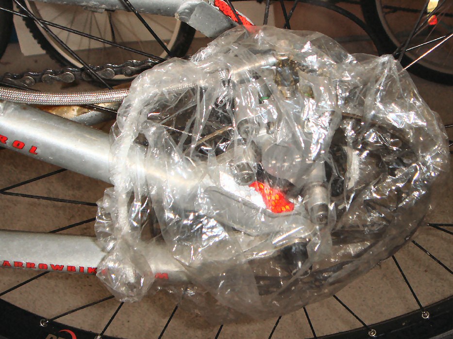 Nachdem ich jeweils das Bike geputzt habe will ich es ölen. Bei den Scheibenbremsen ist dabei aber immer grösste Vorsicht geboten, denn Öl auf der Scheibe versaut im Nu die Beläge und damit die Bremsleistung. Und ein Satz neuer Bremsbeläge kostet doch 37 Franken. Die Duschhauben kann man gut um die Bremsscheibe und den -sattel spannen, so dass alles vor öligem Sprühnebel geschützt ist. Das ist wirklich sehr einfach und praktisch. Seit ich das so mache, habe ich keine Probleme mehr mit quitschenden oder stotternder Bremsen und muss mit dem sprühen von bike shine nicht mehr so aufpassen.